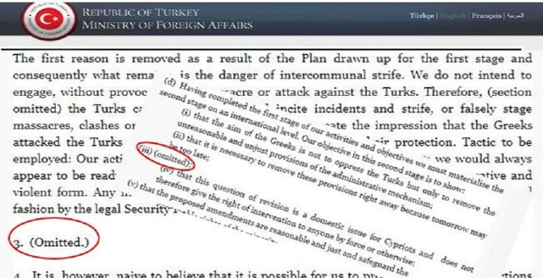«Βλέποντας κάποιος προσεκτικά το Σχέδιο στην τουρκική ιστοσελίδα, θα παρατηρήσει ότι υπάρχουν τρία σημεία που γράφει «παραλείπεται» (omitted). Επιγραμματικά, τα σημαντικά αυτά σημεία που λείπουν, αφορούν ουσιαστικά την τακτική που θ’ ακολουθούσαν οι Ε/κ σε σχέση με τους Τ/κ και πώς θα γινόταν αποδεκτό το αίτημα για μονομερή τροποποίηση του Συντάγματος. Αυτά τα σημεία που παραλείπονται, είναι εκείνα στα οποία σημειώνεται πως οι Ε/κ δεν θα χτυπήσουν τους Τ/κ και θα αποφύγουν μονομερείς ενέργειες που θα προκαλέσουν τ/κ αντίδραση. Αυτά, λοιπόν, τα τρία σημεία, μπορεί κάποιος να τα αντιπαραβάλει με μια κοινώς αποδεκτή εκδοχή του Σχεδίου Ακρίτας, όπως αυτή αναφέρεται στο βιβλίο του Γλαύκου Κληριδη ‘‘Η Κατάθεσή μου”, σελ. 232 και είναι η εξής: