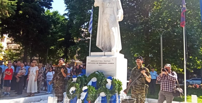 Μετά τη δοξολογία πραγματοποιήθηκε στην Πλατεία Ελευθερίας η επιμνημόσυνη δέηση και η κατάθεση στεφάνων στον ανδριάντα του ήρωα Εμμανουήλ Παπά.