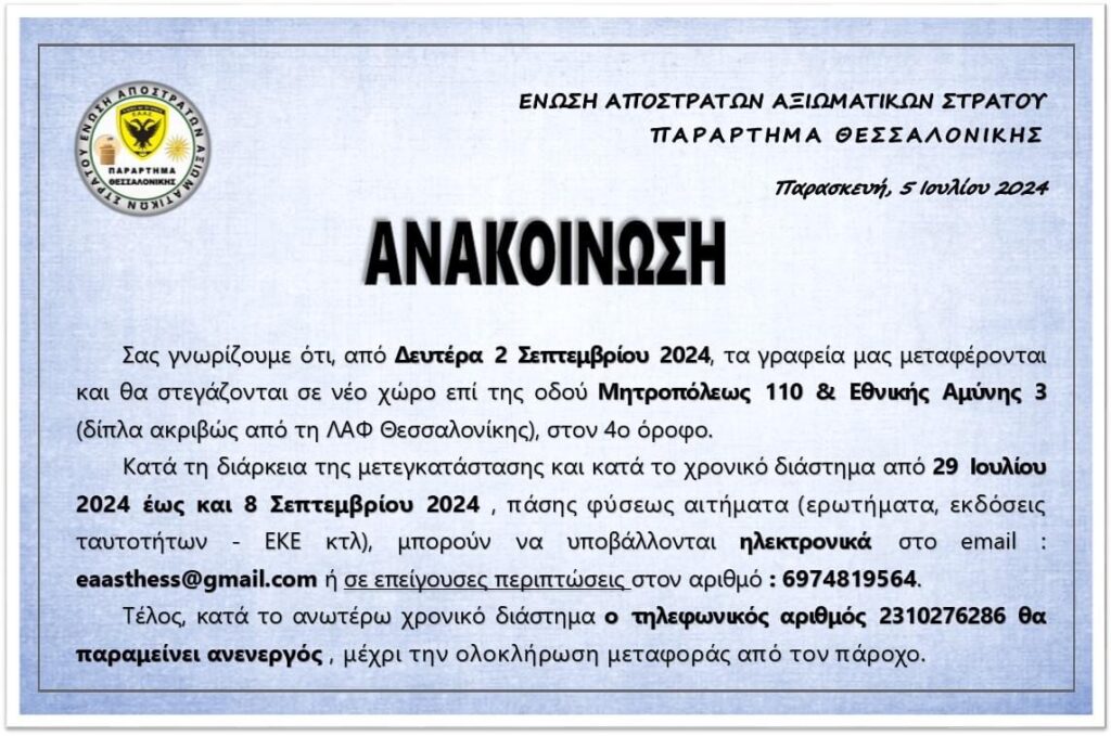 Αλλάζει Έδρα η Ένωση Αποστράτων Αξιωματικών Θεσσαλονίκης και μετακομίζει δίπλα στην Οδό Μητροπόλεως δίπλα στη ΛΑΦΘ