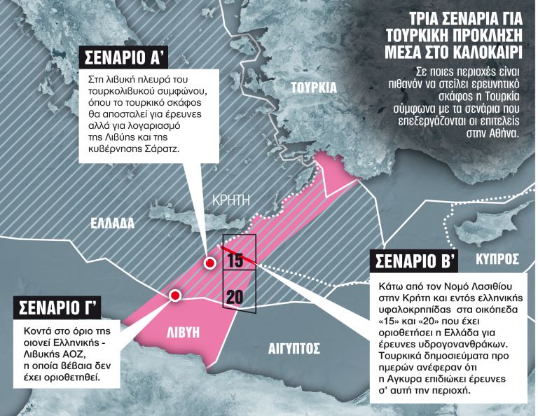 Οσο για το ενδεχόμενο αποστολής τουρκικού γεωτρύπανου, θα σημάνει «συναγερμός» στις Ένοπλες Δυνάμεις με την κάθοδο πολλαπλών μέσων στο σημείο και την ενεργοποίηση σχεδίων για άμεση στρατιωτική εμπλοκή. …Σύμφωνα με tanea.gr