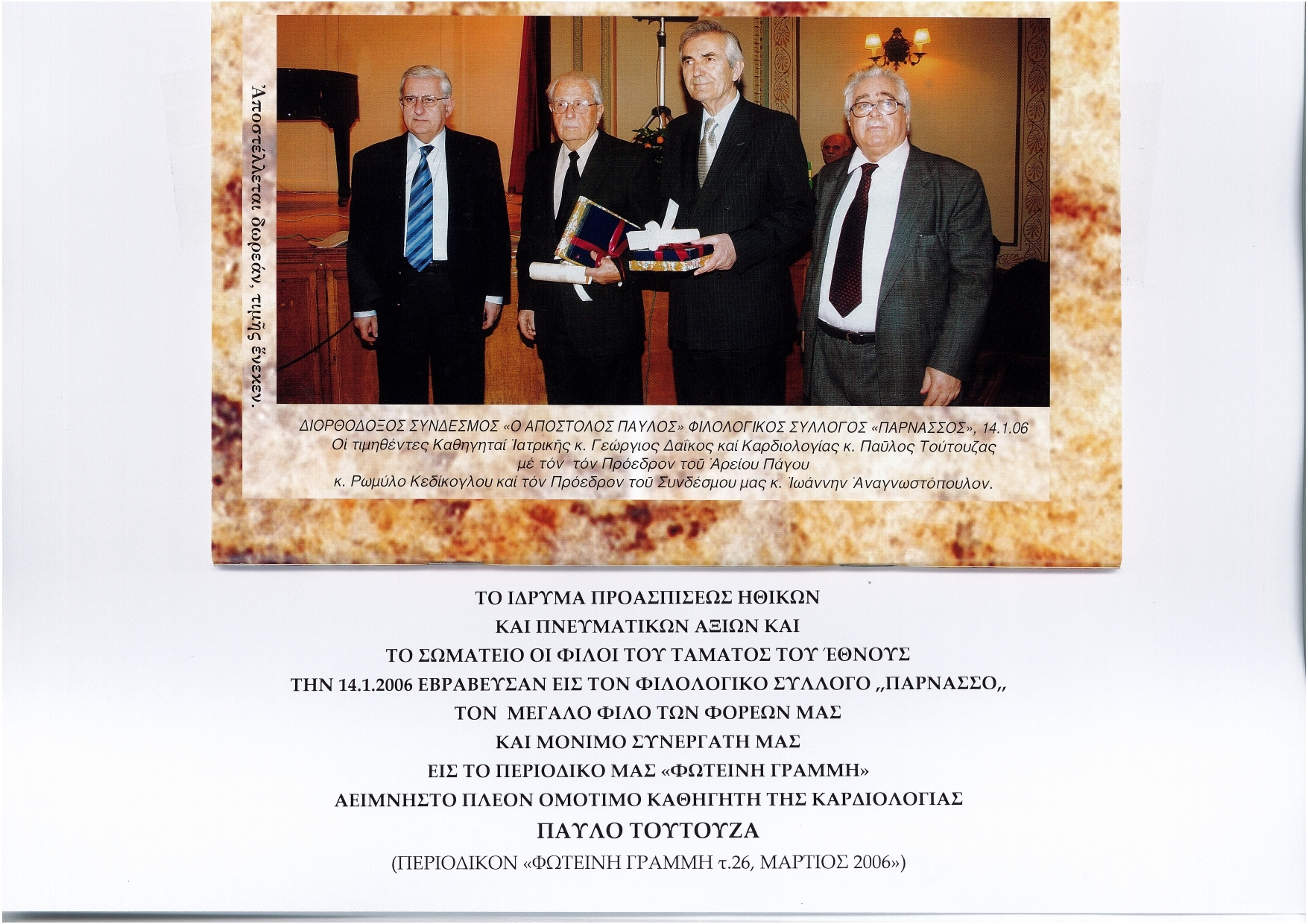Πρωτοπόρος εἰς τὴν ἐπιστήμην του, θεμελιωτὴς τῆς συγχρόνου Ἑλληνικῆς Καρδιολογίας, διεθνῶς ἀνεγνωρισμένος, τόσον σπουδαῖος ἀλλὰ καὶ τὀσον ἁπλὸς καὶ ἀνθρώπινος, εὐλαβὴς καὶ ταπεινός.
