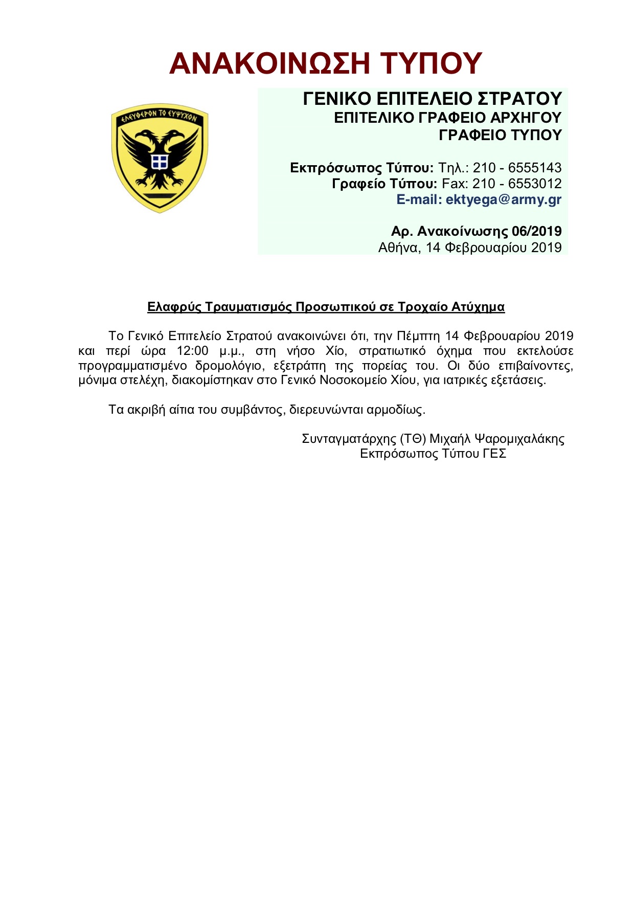 Στο Νοσοκομείο Χίου μεταφέρθηκαν το μεσημέρι της Πέμπτης δύο στρατιωτικοί που επέβαιναν σε στρατιωτικό όχημα, το οποίο ανατράπηκε έξω από την 96 Επιλαρχία Αρμάτων Εθνοφυλακής στο Χαλκειός.
