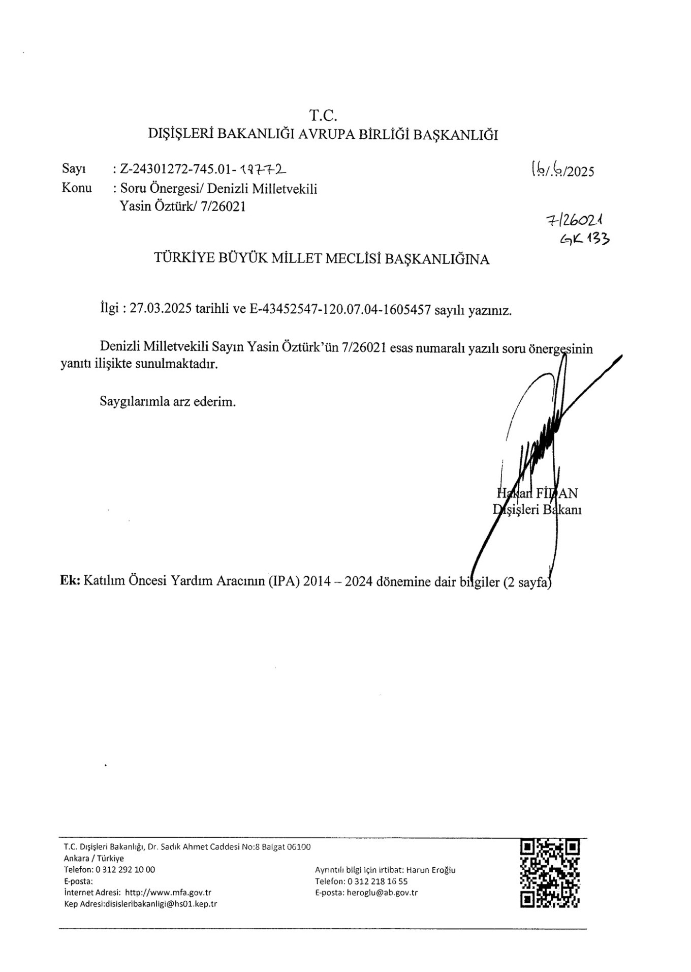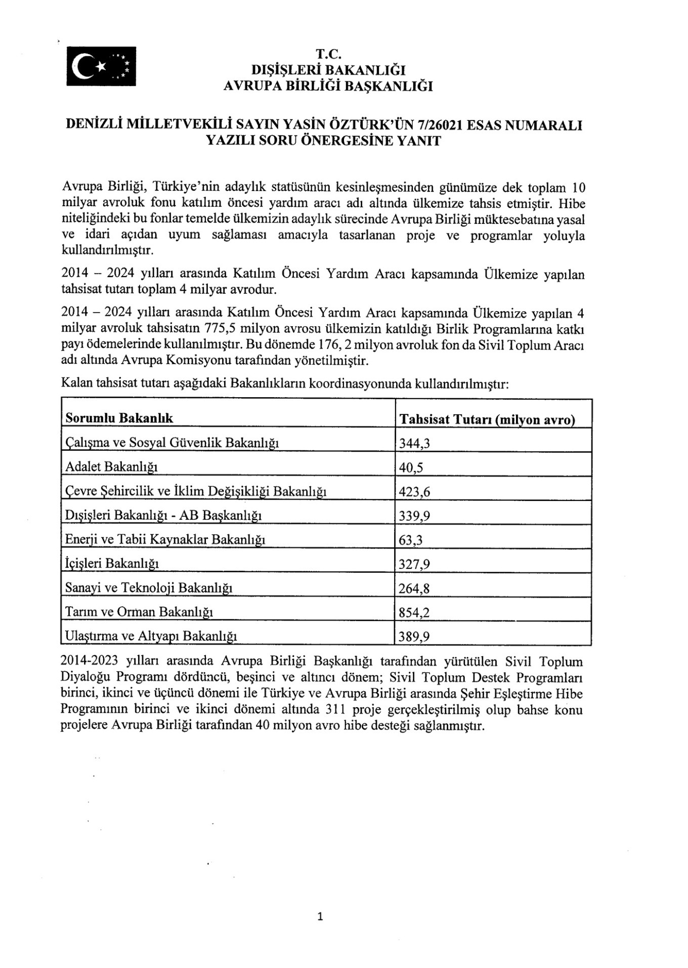 Σύμφωνα με το δημοσίευμα, ο Τούρκος ΥΠΕΞ Χακάν Φιντάν αποκάλυψε σε επιστολή προς το τουρκικό κοινοβούλιο ότι το υπουργείο Εξωτερικών δαπάνησε 339,9 εκατ. ευρώ και το Υπουργείο Εσωτερικών 327,9 εκατ. ευρώ από κοινοτικά κονδύλια. Ωστόσο, δεν εξήγησε πώς χρησιμοποιήθηκαν.