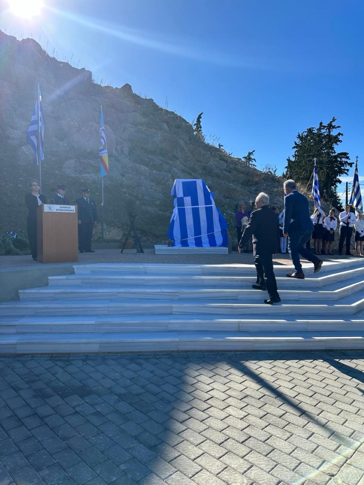 Τα αποκαλυπτήρια του Μνημείου πραγματοποίησαν ο Βουλευτής Ν. Αργολίδας κ. Γιάννης Ανδριανός ως εκπρόσωπος του Προέδρου της Βουλής των Ελλήνων, ο Δήμαρχος Ερμιονίδας, κ. Ιωάννης Γεωργόπουλος, ο Πρόεδρος του Συμβουλίου της Κοινότητας Ερμιόνης, κ. Ιωσήφ Γανώσης και μέλη της οικογένειας του πεσόντος.