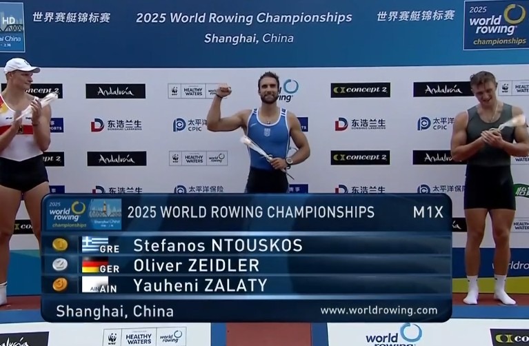 Εμφανώς καταβεβλημένος, αλλά τρισευτυχισμένος για το χρυσό μετάλλιο που κατέκτησε στο μονό σκιφ στο Παγκόσμιο κωπηλασίας της Σανγκάης παρουσιάστηκε ο Στέφανος Ντούσκος μετά τη σπουδαία κούρσα του.