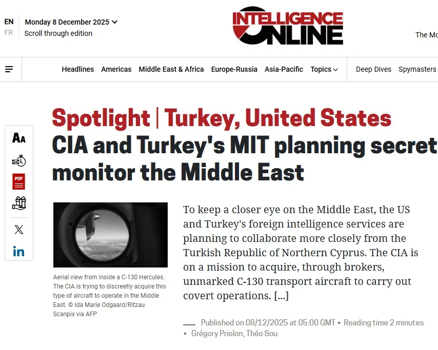 Σοβαρά ερωτήματα για τις ισορροπίες στην Ανατολική Μεσόγειο προκαλεί δημοσίευμα του Intelligence Online, σύμφωνα με το οποίο η CIA και η τουρκική υπηρεσία πληροφοριών MİT εξετάζουν τη δημιουργία μυστικής αεροπορικής βάσης στα κατεχόμενα. Η εγκατάσταση, όπως αναφέρεται, προορίζεται για επιχειρήσεις επιτήρησης και παρακολούθησης στη Μέση Ανατολή, σε μια περίοδο κατά την οποία η περιοχή βρίσκεται υπό συνεχή γεωπολιτική αναταραχή.