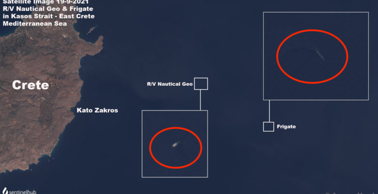 Την στιγμή της δορυφορικής εικόνας το Γαλλικό ερευνητικό Nautical Geo βρίσκεται στα ~8.5 ν.μ από την κοντινότερη Κρητική ακτή και η Τούρκικη φρεγάτα σε απόσταση αναπνοής
