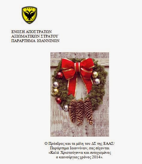 <style type="text/css"><!-- P { margin-bottom: 0.21cm; } --></style> <h2 style="text-align: center;" align="CENTER">Ο Πρόεδρος και τα μέλη του ΔΣ της ΕΑΑΣ/<a href="http://veteranos.gr/wp-content/uploads/2013/12/ευχες-εαασ-ιωαννινων.jpg"><img class="size-full wp-image-2153 aligncenter" alt="ευχες εαασ ιωαννινων" src="http://veteranos.gr/wp-content/uploads/2013/12/ευχες-εαασ-ιωαννινων.jpg" width="474" height="546" /></a></h2> <h2 align="CENTER"><strong> Παράρτημα Ιωαννίνων, σας εύχονται</strong></h2> <h2 align="CENTER"><strong>«Καλά Χριστούγεννα και ευτυχισμένος</strong></h2> <h2 align="CENTER"><strong>ο καινούργιος χρόνος 2014».</strong></h2> <h2 align="CENTER"><strong> Ο Πρόεδρος</strong></h2> <h2 align="CENTER"><strong>Υπτγος ε.α. Γεώργιος Γκορέζης</strong></h2>