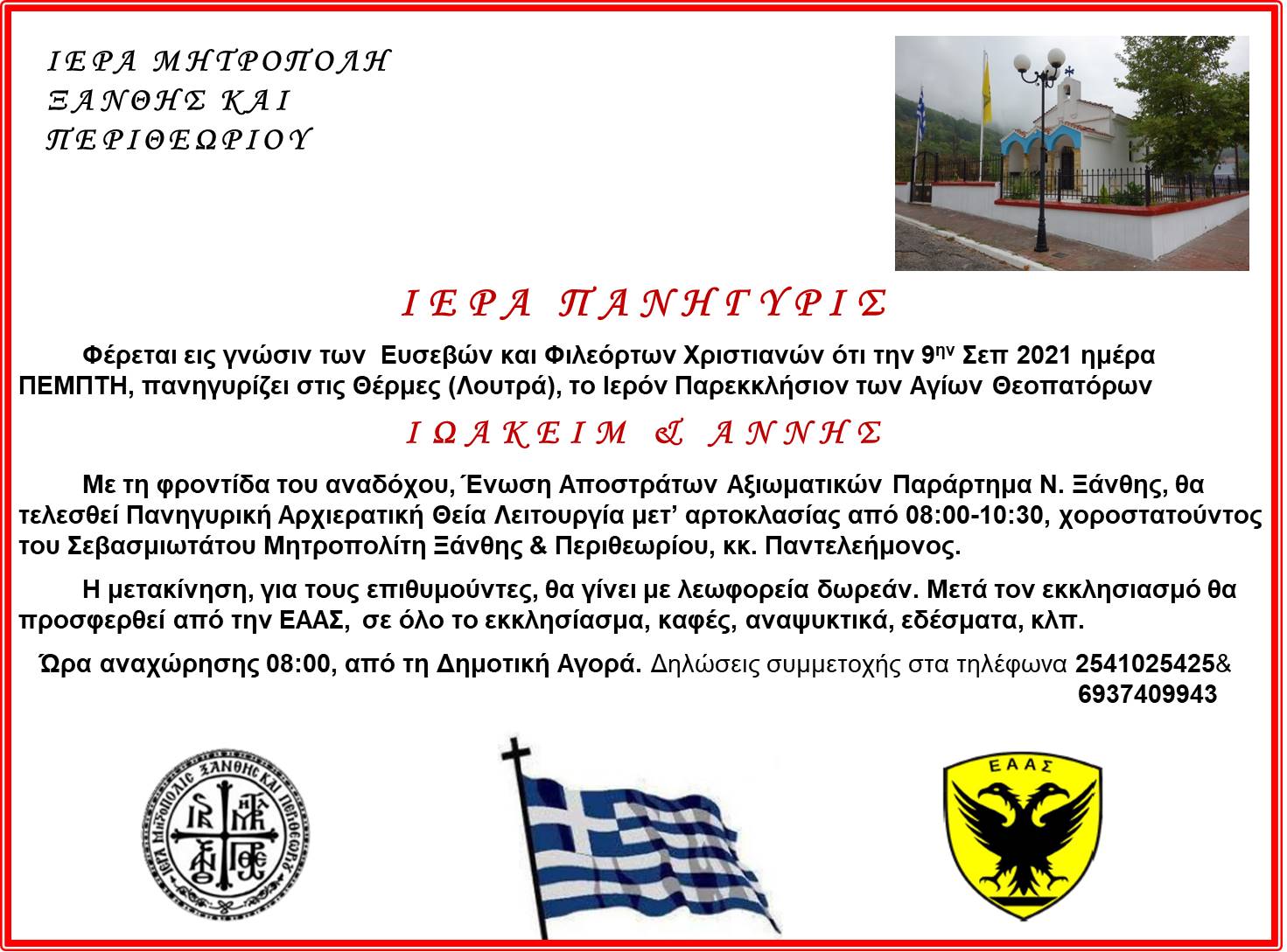 ΠΡΟΣΚΛΗΣΗ του Παραρτήματος ΕΑΑΣ Ξάνθης σχετική με τον Εκκλησιασμό που θα πραγματοποιηθεί στις 9 Σεπτεμβρίου 2021 ημέρα Πέμπτη στον Ιερό Ναό των Αγίων Θεοπατόρων Ιωακείμ και Άννης στις Θέρμες (Λουτρά) σύμφωνα με το Πρόγραμμα “Εκκλησιασμοί στα Πομακοχώρια του Ν. Ξάνθης 2021”.