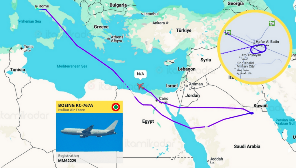 Ένα Boeing KC-767A της Ιταλικής Πολεμικής Αεροπορίας (με αριθμό μητρώου MM62229) εκτρέπεται προς την Souda Bay AB, αφού βρισκόταν καθ’ οδόν προς το Κουβέιτ.