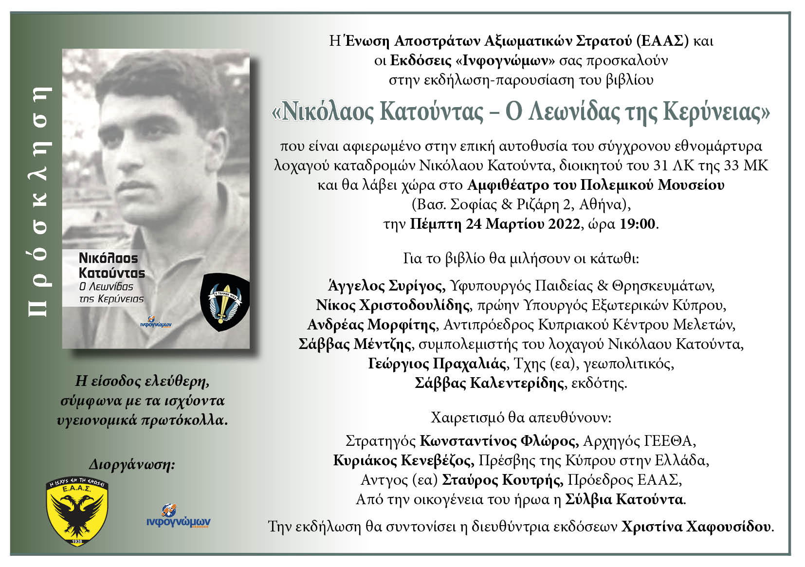 Η Ένωση Αποστράτων Αξιωματικών Στρατού (ΕΑΑΣ) και οι Εκδόσεις «Ινφογνώμων» σας προσκαλούν στην εκδήλωση-παρουσίαση του βιβλίου «Νικόλαος Κατούντας – Ο Λεωνίδας της Κερύνειας»
