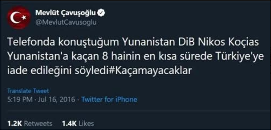 Την εντολή επιβεβαιώνει ένα μήνυμα που μοιράστηκε ο Τούρκος υπουργός Εξωτερικών Mevlüt Çavuşoğlu στο Twitter στις 17:15 στις 16 Ιουλίου, στο οποίο είπε ότι είχε μιλήσει με τον τότε Έλληνα Υπουργό Εξωτερικών Νίκο Κοτζιά στο τηλέφωνο και ισχυρίστηκε ότι ο Κοτζιάς τον διαβεβαίωσε ότι η Ελλάδα θα επιστρέψει τους οκτώ στρατιώτες το συντομότερο δυνατό.