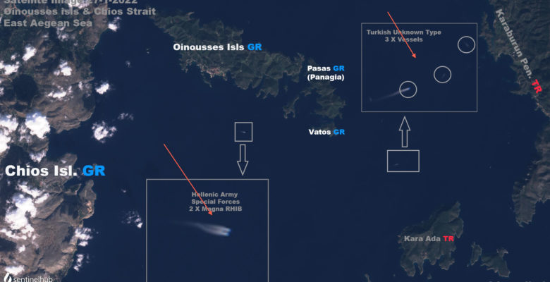 Δορυφορική εικόνα από τις 27-1-2022 Οινούσσες και στενά Χίου όπου ζεύγος φουσκωτών σκαφών των Ειδικών Δυνάμεων πλέουν προς τη νήσο Παναγία ενώ 3 τουρκικά σκάφη αγνώστου τύπου βρίσκονται στη νότια είσοδο του στενού Egriliman.