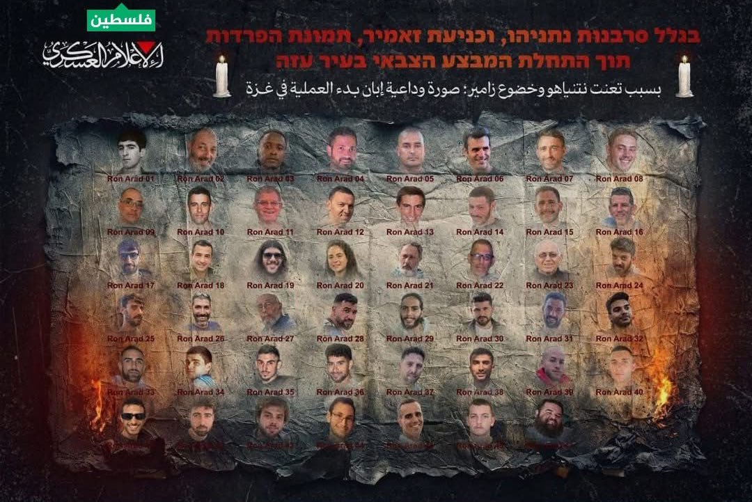 Η Χαμάς δημοσίευσε χθες εικόνα με τους 48 εναπομείναντες ομήρους που κρατούνται στη Λωρίδα της Γάζας, χαρακτηρίζοντάς τους όλους «Ρον Αράντ», παραπέμποντας στον Ισραηλινό αεροπόρο που αγνοείται από το 1988.