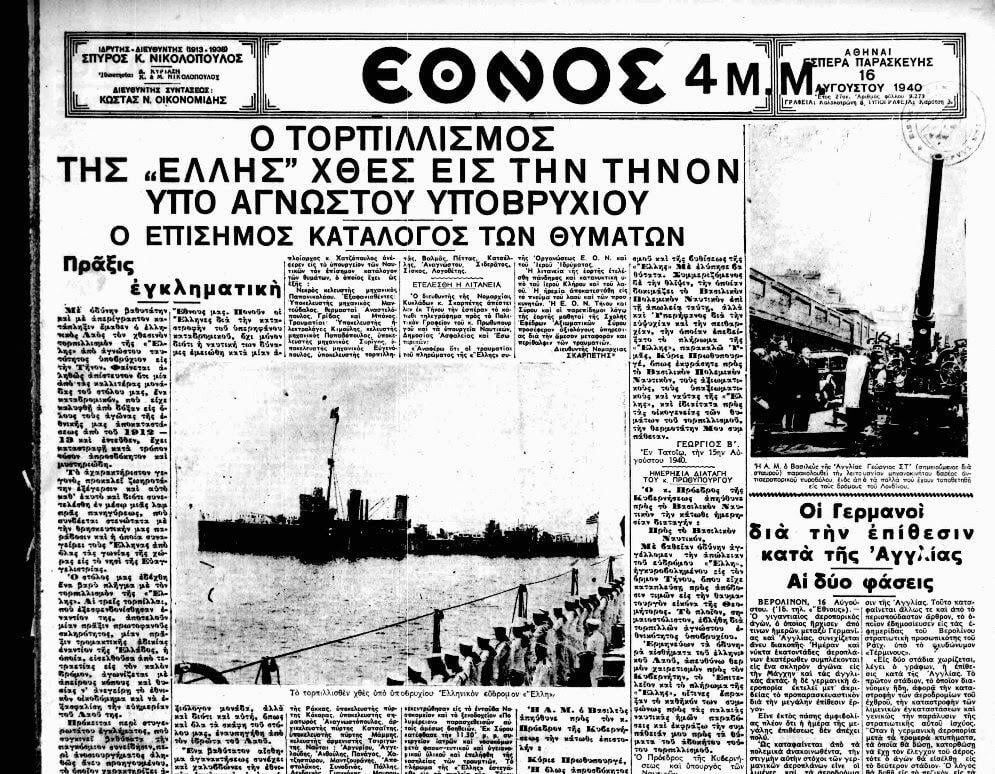 Πρωτοσέλιδο της εφημερίδας «Έθνος» μία ημέρα μετά τον τορπιλισμό