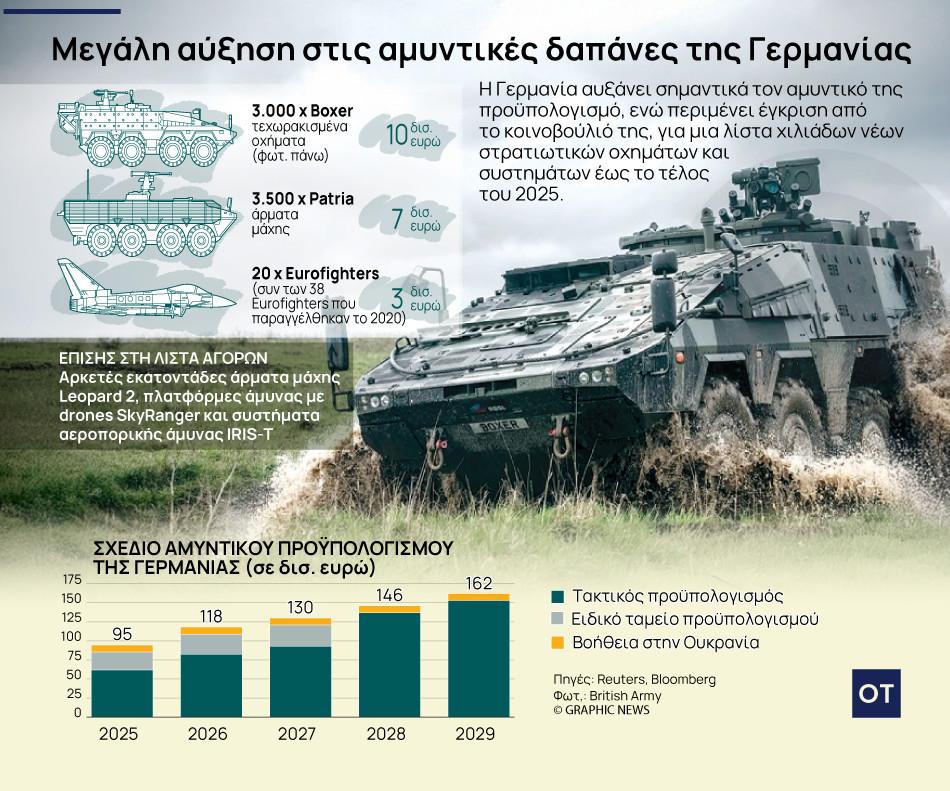 Η Γερμανία ετοιμάζει ένα κύμα παραγγελιών για στρατιωτικά οχήματα, πολεμικά αεροσκάφη και άλλο στρατιωτικό υλικό και προμήθειες ύψους πολλών δισεκατομμυρίων ευρώ, συμπεριλαμβανομένων 20 αεροσκαφών Eurofighter, έως και 3.000 τεθωρακισμένων οχημάτων Boxer και έως 3.500 οχημάτων μάχης πεζικού Patria, δήλωσαν στο Reuters δύο πηγές που γνωρίζουν τα σχέδια.
