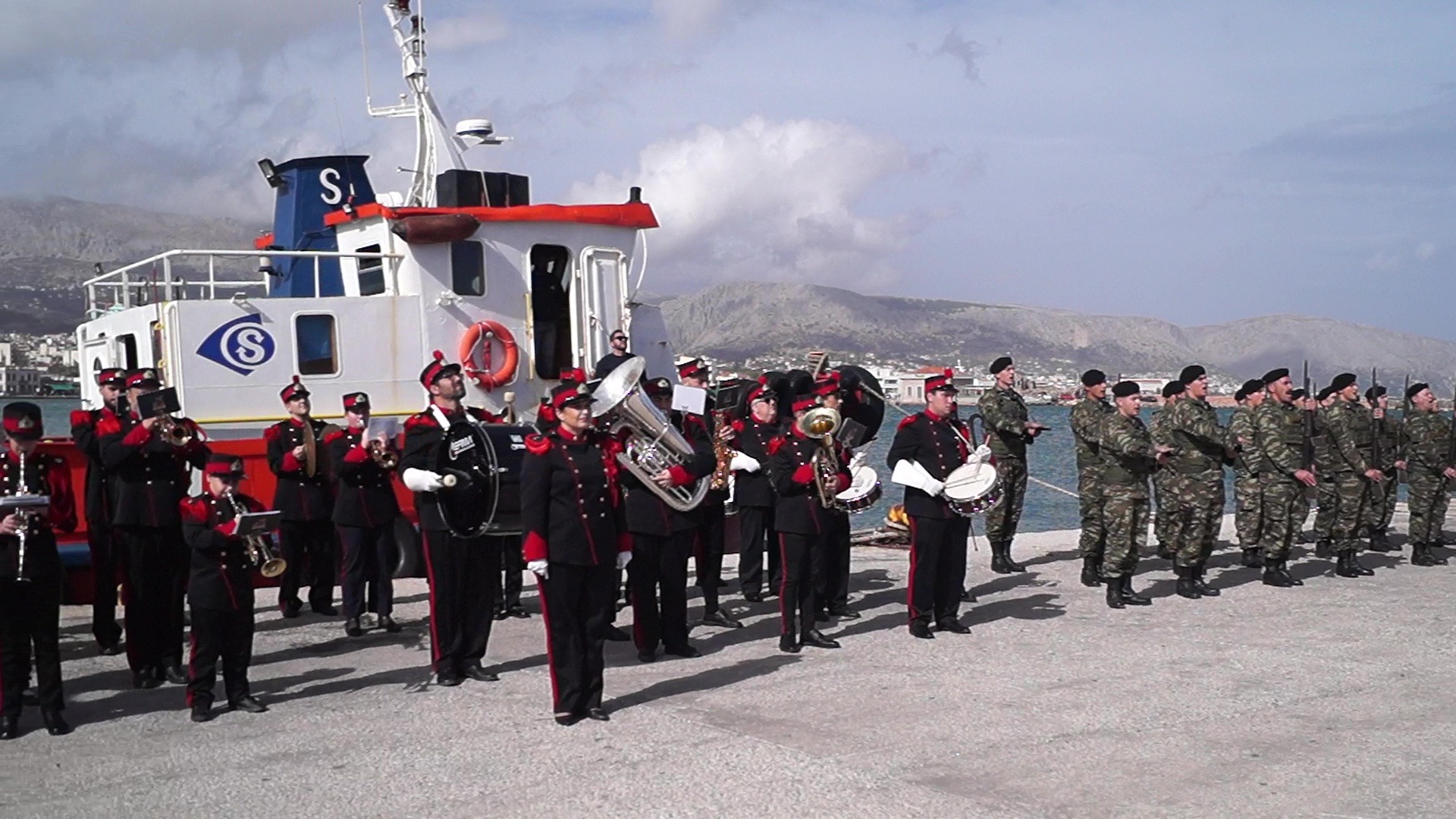 Η επιβλητική σημαία μεταφέρθηκε με πομπή από σπουδαστές της Ακαδημίας Εμπορικού Ναυτικού (ΑΕΝ) Μηχανικών Χίου, οι οποίοι διέσχισαν τη Λεωφόρο Αιγαίου ενώ πλήθος πολιτών παρακολουθούσε με συγκίνηση την πορεία και την τελετή στο Λιμάνι.