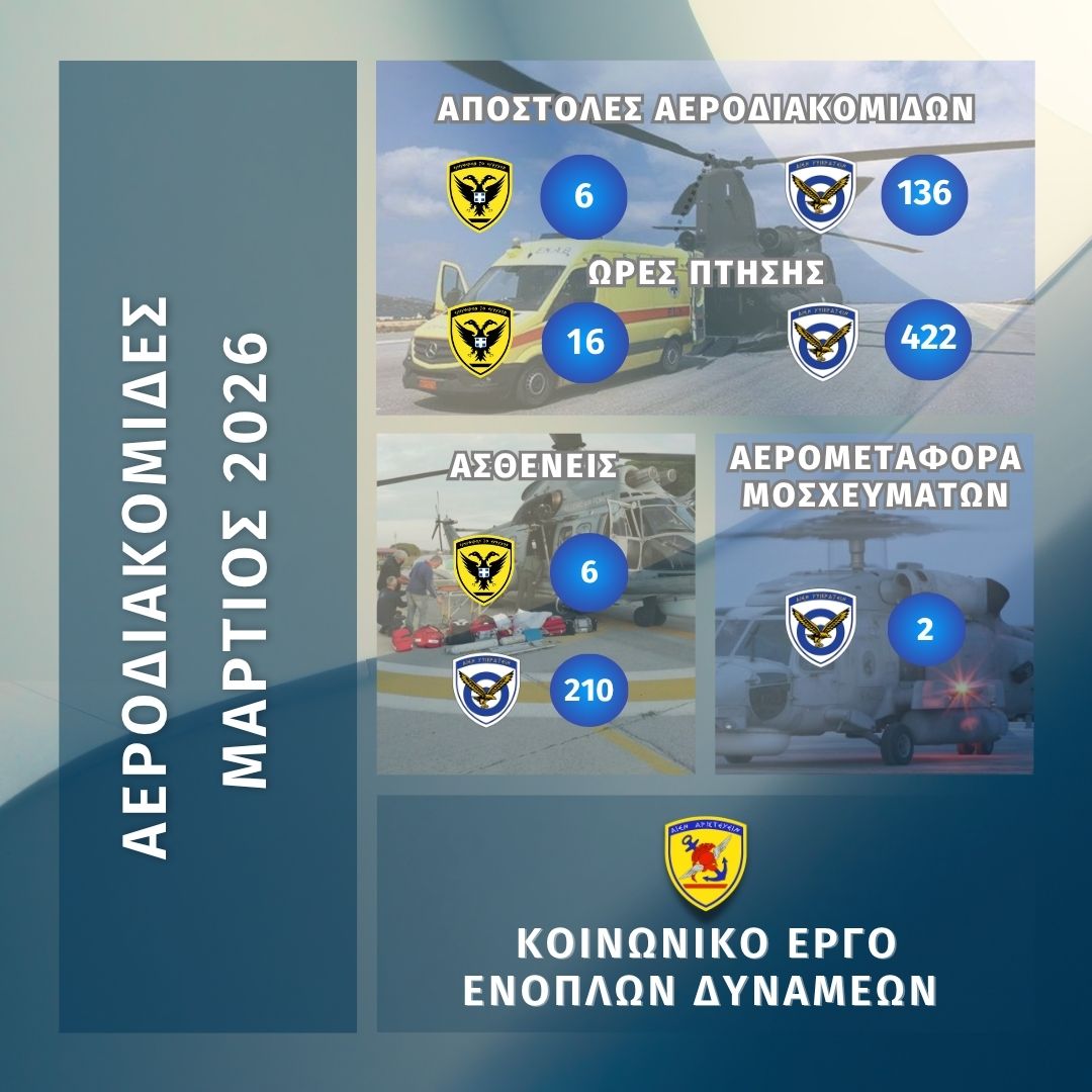 Οι Ένοπλες Δυνάμεις στο πλαίσιο της κοινωνικής τους προσφοράς, πραγματοποίησαν σύνολο 142 αεροδιακομιδές και μετέφεραν 216 ασθενείς.