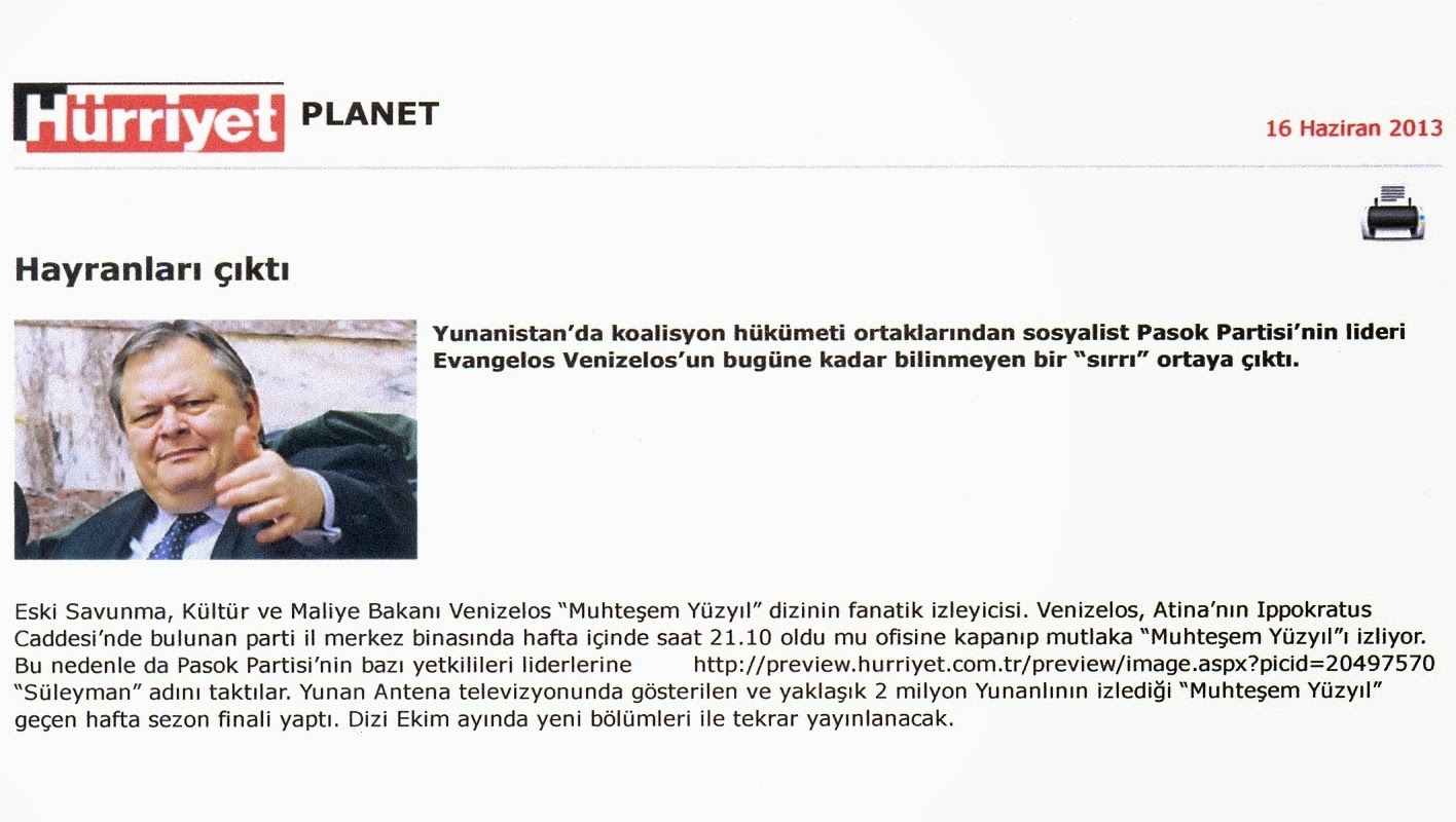 Όπως υποστήριξε η τουρκική εφημερίδα σε ένα χαρακτηριστικό της άρθρο, ο κ. Βενιζέλος αποκάλυψε ένα μεγάλο «μυστικό» του και αυτό είναι ότι στο γραφείο του στην οδό Ιπποκράτους μετά της 9 η ώρα το βραδύ και ενώ φαίνεται πως έχει τελειώσει όλες τις άλλες πολιτικές του εργασίες, ανοίγει την τηλεόραση για… να παρακολουθήσει το αγαπημένο του σήριαλ, τον Σουλεϊμάν τον Μεγαλοπρεπή.