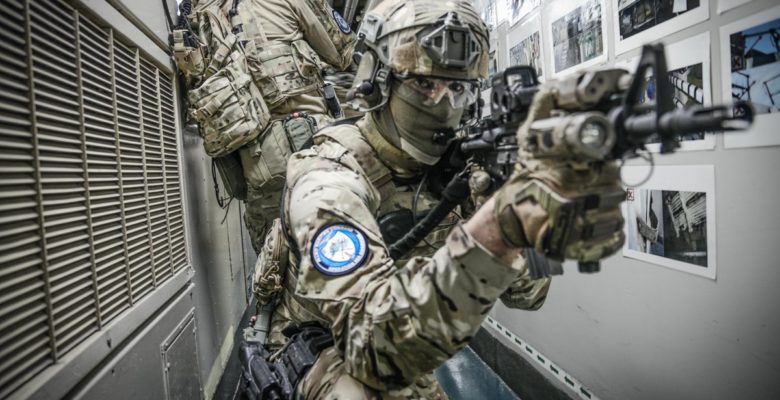HellenicNavy SOF armed with Mk.18 Mod0 5.56mm carbine with EOTech XPS holographic sight, AN/PEQ-15 IR module and SureFire M720V weapon light and a Glock 17 Pistol conducting boarding exercise as a part of NATO Operation SEA GUARDIAN in East Med