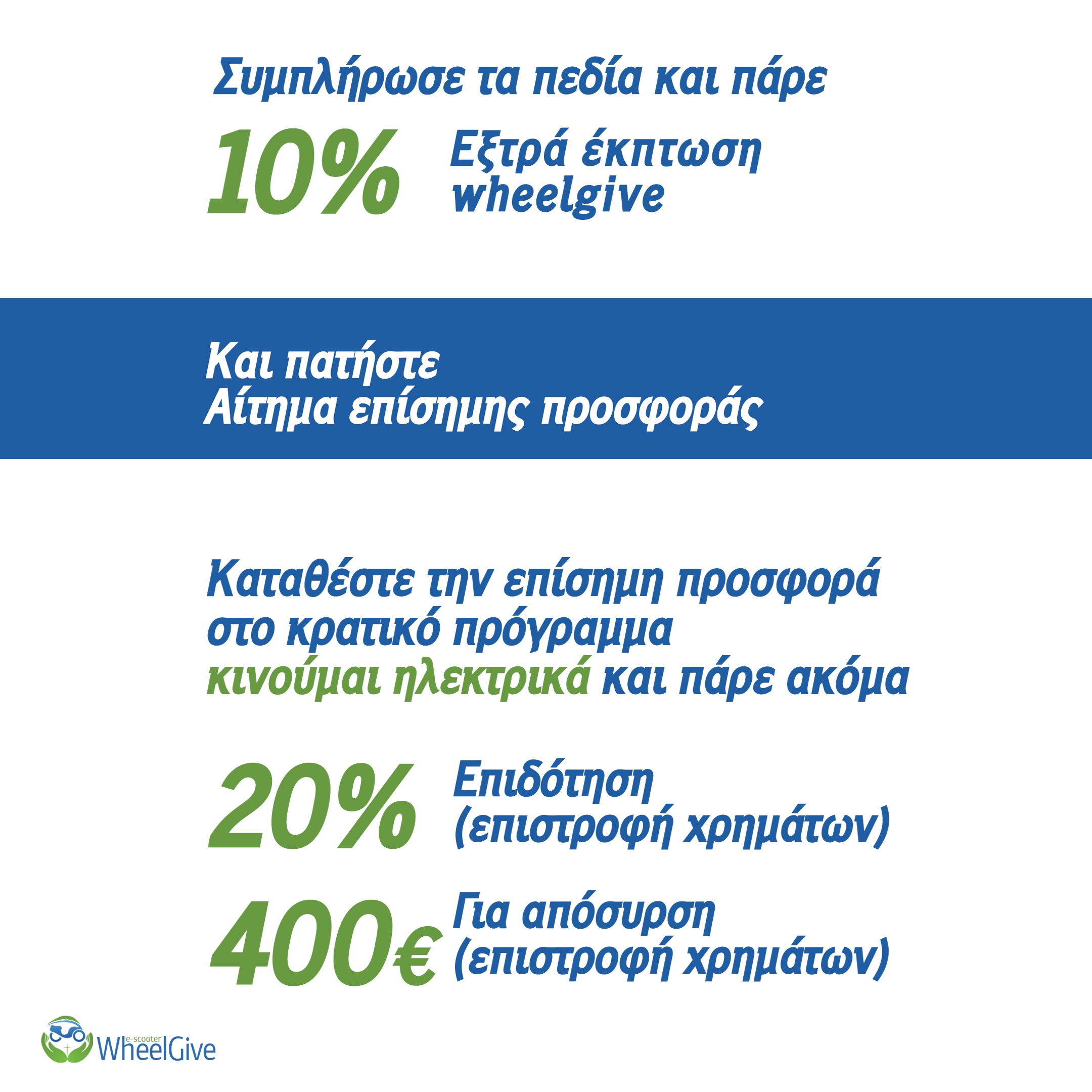 Εκεί θα βρείτε ερωτήσεις κι απαντήσεις που θα σας βοηθήσουν σε ότι άφορα την έξτρα επιδότηση 10% εως 12% από την Wheelgive αλλά και πληροφορίες που αφορούν το κρατικό πρόγραμμα κινούμαι ηλεκτρικά