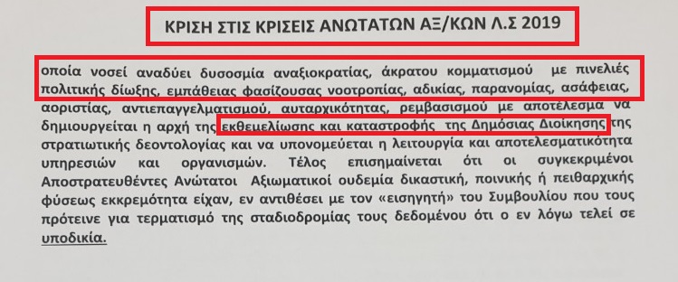 Με αποτέλεσμα να δημιουργούνται προϋποθέσεις εκθεμελίωσης και καταστροφής της Δημόσιας Διοίκησης, της στρατιωτικής δεοντολογίας και να υπονομεύεται η λειτουργία και η αποτελεσματικότητα υπηρεσιών και οργανισμών.