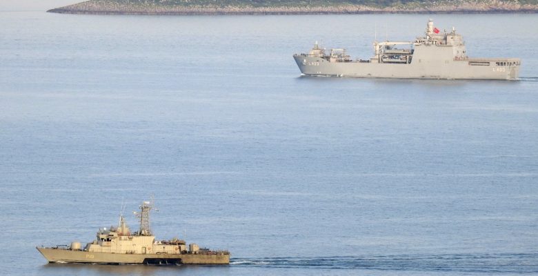 Η Κανονιοφόρος κλάσης Osprey 55 του Ελληνικού Πολεμικού Ναυτικού P19 HS Navmachos συνοδεύει αμφίβια αποβατικά σκάφη του τουρκικού Πολεμικού Ναυτικού LST, LCT με βόρεια κατεύθυνση στο Στενό της Χίου στο ανατολικό Αιγαίο κατά τη διάρκεια της τουρκικής άσκησης Mavi Vatan 2022.