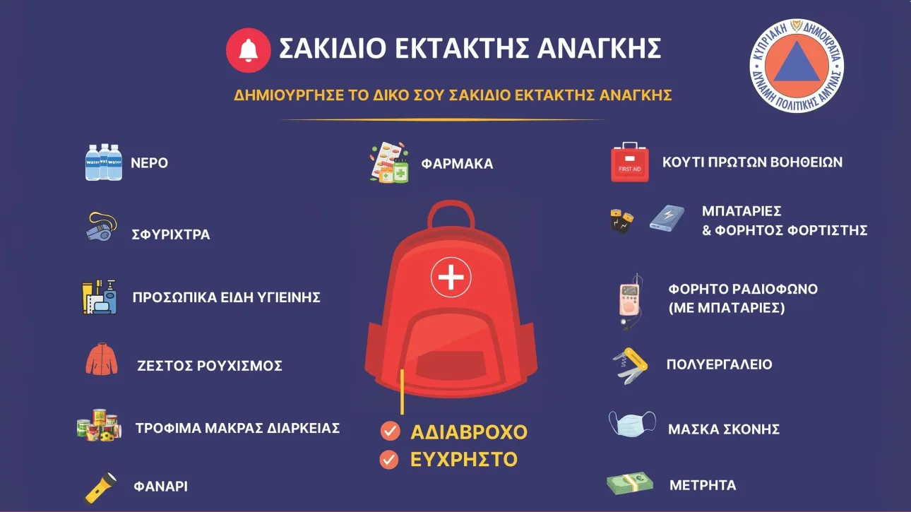 Το Υπουργείο Εσωτερικών Κύπρου απευθύνει σαφείς οδηγίες προς τους πολίτες, καλώντας τους να προετοιμαστούν εγκαίρως δημιουργώντας σακίδιο έκτακτης ανάγκης, σε περίπτωση που απαιτηθεί άμεση μετακίνησή τους σε καταφύγιο.