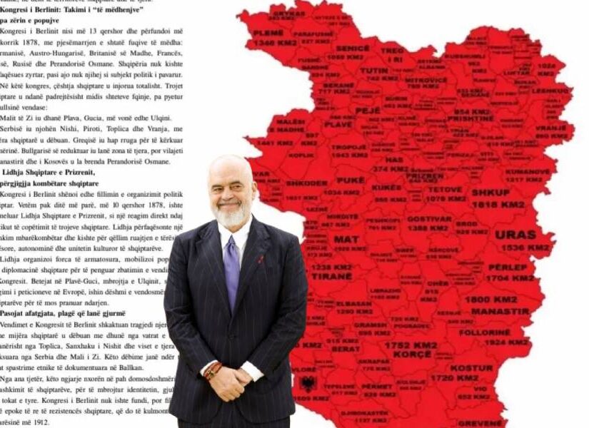 Στον χάρτη απεικονίζονται εκτεταμένα ελληνικά εδάφη, τα οποία παρουσιάζονται ως «ιστορικές αλβανικές περιοχές» με συγκεκριμένες αναγραφές τοπωνυμίων και εκτάσεων σε τετραγωνικά χιλιόμετρα.
