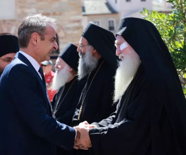 Με επισημότητα υποδέχθηκαν τα μέλη της Διπλής Ιεράς Σύναξης (ηγούμενοι και αντιπρόσωποι των είκοσι μονών) του Αγίου Όρους τον πρωθυπουργό Κυριάκο Μητσοτάκη.