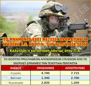 Συγκεκριμένα, από την 1η Ιανουάριου 2010 έως τις 30 Απριλίου 2015 (μέσα δηλαδή σε πέντε χρόνια και τέσσερις μήνες που η χώρα βρίσκεται στη μέγγενη του Μνημονίου) στον Στρατό Ξηράς εισήλθαν συνολικά 4.740 αξιωματικοί, υπαξιωματικοί και επαγγελματίες οπλίτες, αλλά την ίδια στιγμή αποστρατεύτηκαν ή παραιτήθηκαν 7.715 στελέχη, κυρίως αξιωματικοί και υπαξιωματικοί με πολλά χρόνια υπηρεσίας. Το ισοζύγιο των στελεχών στο Πολεμικό Ναυτικό είναι ακόμη πιο δραματικό. Στις τάξεις του κλάδου εντάχθηκαν 1.340 στελέχη, και αποστρατεύθηκαν ή παραιτήθηκαν υπερδιπλάσιος αριθμός στελεχών, 2.700. Στην Πολεμική Αεροπορία η κατάσταση είναι καλύτερη, χωρίς όμως αυτό να σημαίνει πως δεν υπάρχουν προβλήματα.