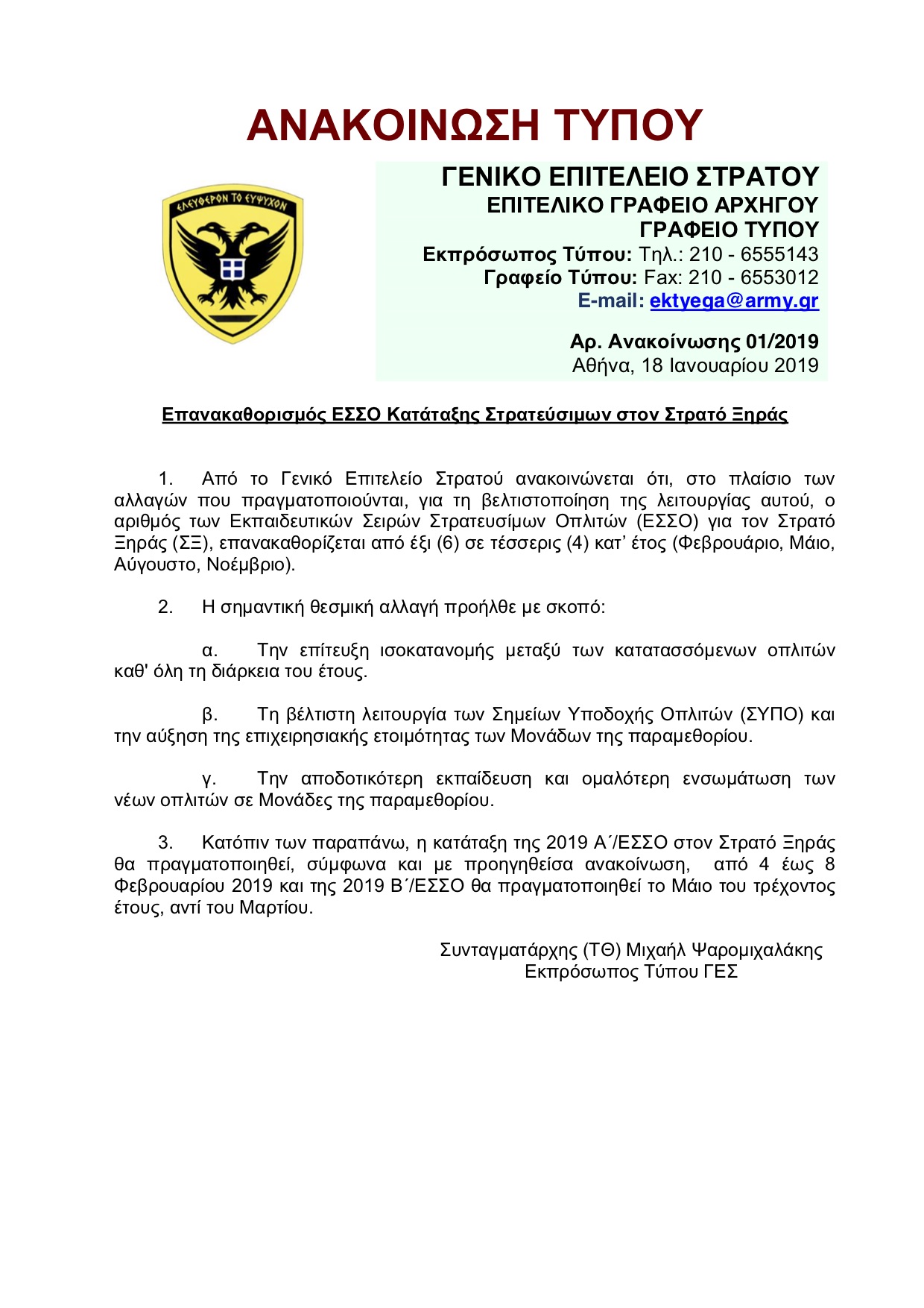 Η κατάταξη της Πρώτης ΕΣΣΟ στον Στρατό Ξηράς (2019 Α/ΕΣΣΟ) θα γίνει από 4 έως 8 Φεβρουαρίου 2019.