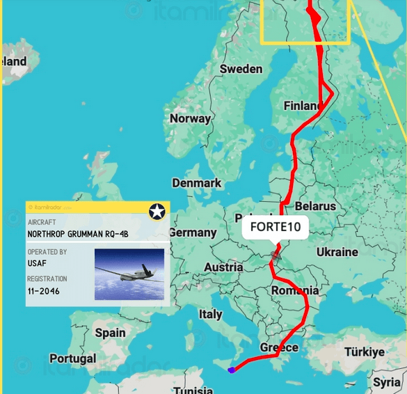 Ένα αμερικανικό αεροσκάφος Northrop Grumman RQ-4B (reg. 11-2046 – c/s FORTE10) επιστρέφει αυτή τη στιγμή στο NAS Sigonella μετά την ολοκλήρωση μιας αποστολής που διήρκεσε περισσότερες από 24 ώρες.