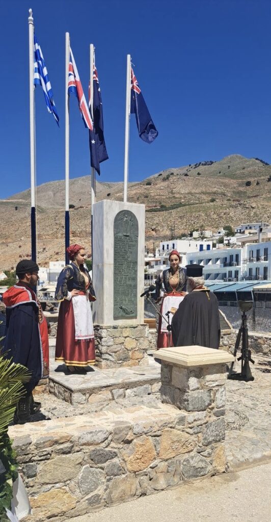 Ακολούθησε κατάθεση στεφάνων από τον Αντιπεριφερειάρχη Χανίων Νικόλαο Καλογερή, τον Δήμαρχο Σφακίων Ιωάννη Ζερβό, την Ακόλουθο της Πρεσβείας της Αυστραλίας, Πλοίαρχο Rachel Jones, τον Αντισυνταγματάρχη Πεζικού της 5ης Αερομεταφερόμενης Ταξιαρχίας Εμμανουήλ Μπολιώτη, τον Διοικητή του Α.Τ. Αερολιμένα Χανίων, Αστυνόμο Α’ Ευτύχιο Μαλανδράκη, τον Διοικητή της Πυροσβεστικής Υπηρεσίας Βρυσών, Επιπυραγό Σωτήριο Αργυρόπουλο, τον Λιμενοσταθμάρχη του Λιμενικού Σταθμού Χώρας Σφακίων, Σημαιοφόρο Νικόλαο Ζαμπετάκη, εκπρόσωπο της Υφυπουργού Μετανάστευσης και Ασύλου, Σέβης Βολουδάκη, εκπροσώπους των Βουλευτών της Ν.Δ. Χανίων, Ντόρας Μπακογιάννη και Αλέξανδρου Μαρκογιαννάκη, τον εκπρόσωπο της Τομεακής Επιτροπής του ΚΚΕ, Περιφερειακό Σύμβουλο Αλέξανδρο Μαρινάκη, τον Δήμαρχο Μυλοποτάμου Γεώργιο Κλάδο, τους Αντιδημάρχους Αποκορώνου και Καντάνου-Σελίνου, Γεώργιο Γυπαράκη και Ιωάννη Βαρδουλάκη, εκπρόσωπους της Ένωσης Λιμενικών της Νέας Ζηλανδίας και του Δικτύου Μαρτυρικών Χωριών και Πόλεων, τον Πρόεδρο της Δημοτικής Κοινότητας Χώρας Σφακίων Ιωάννη Μπραουδάκη, καθώς και από μαθητές του Δημοτικού Σχολείου Χώρας Σφακίων.
