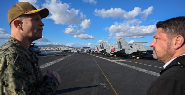 Τον Υφυπουργό Εθνικής Άμυνας υποδέχθηκαν ο Διοικητής της Δύναμης Κρούσης 10 (Commander Carrier Strike Group 10) Υποναύαρχος Dennis Velez και ο Κυβερνήτης Πλοίαρχος David-Tavis Pollard, οι οποίοι τον ενημέρωσαν τόσο για τις επιχειρησιακές δυνατότητες του αεροπλανοφόρου όσο και για το εύρος των αποστολών που μπορεί να αναλάβει.