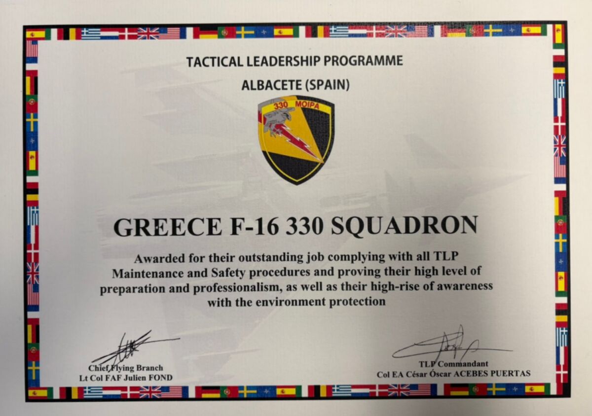 Σημαντική διάκριση πέτυχε η Πολεμική Αεροπορία (ΠΑ) στο πλαίσιο της συμμετοχής της στην 1η Εκπαιδευτική Σειρά Αέρος του Tactical Leadership Programme (TLP) 2026, η οποία πραγματοποιήθηκε στην Αεροπορική Βάση Los Llanos Air Base στο Albacete της Ισπανίας.