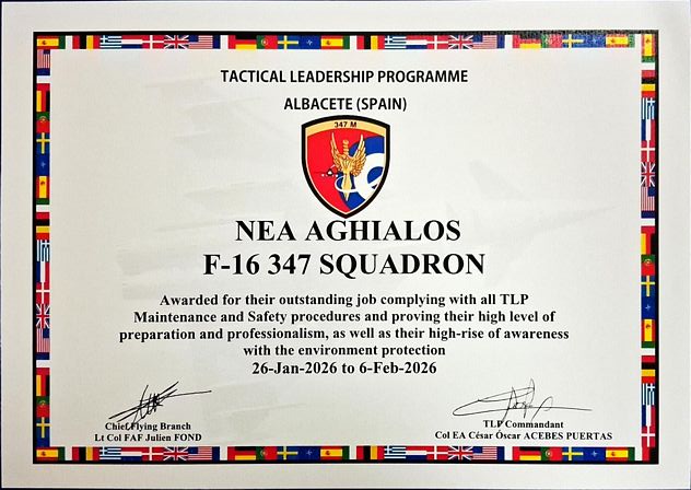 Σημαντική διάκριση πέτυχε η Πολεμική Αεροπορία (ΠΑ) στο πλαίσιο της συμμετοχής της στην 1η Εκπαιδευτική Σειρά Αέρος του Tactical Leadership Programme (TLP) 2026, η οποία πραγματοποιήθηκε στην Αεροπορική Βάση Los Llanos Air Base στο Albacete της Ισπανίας.