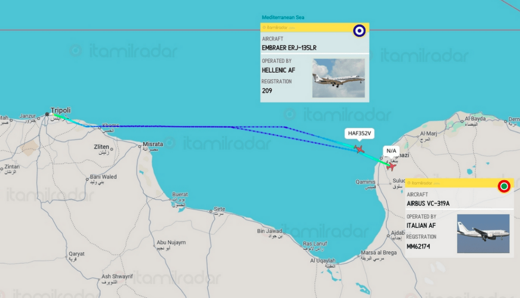 Χθες το απόγευμα, γύρω στις 14:30 CEST, δύο στρατιωτικά αεροσκάφη προσγειώθηκαν στο αεροδρόμιο της Βεγγάζης: ένα Airbus VC-319A της Ιταλικής Πολεμικής Αεροπορίας (αριθμός μητρώου MM62174) και ένα Embraer ERJ-135LR της Ελληνικής Πολεμικής Αεροπορίας (αριθμός μητρώου 209, διακριτικός κλήσης HAF352V).
