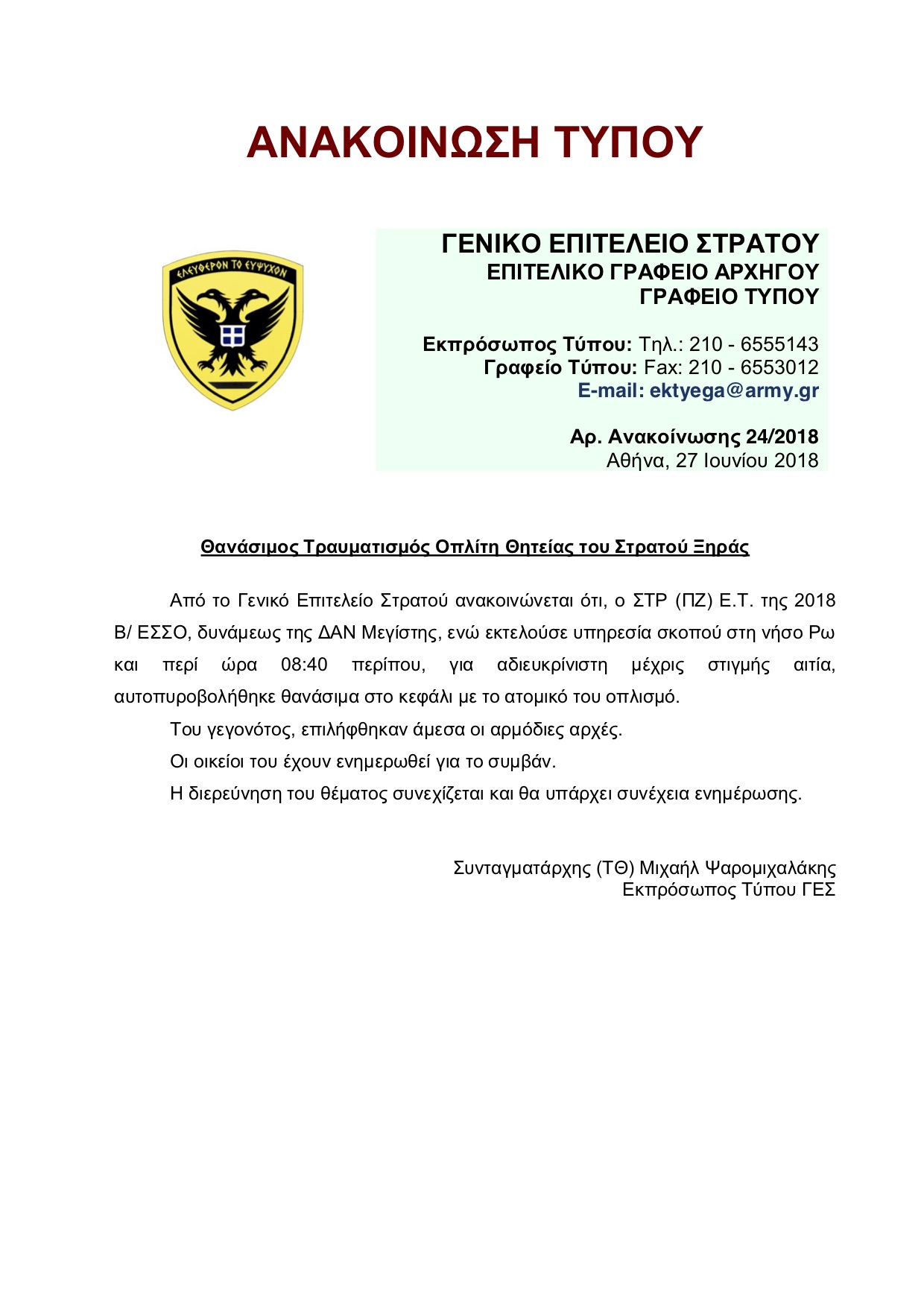 Από το Γενικό Επιτελείο Στρατού ανακοινώνεται ότι, ο ΣΤΡ (ΠΖ) Ε.Τ. της 2018 Β/ ΕΣΣΟ, δυνάμεως της ΔΑΝ Μεγίστης, ενώ εκτελούσε υπηρεσία σκοπού στη νήσο Ρω και περί ώρα 08:40 περίπου…