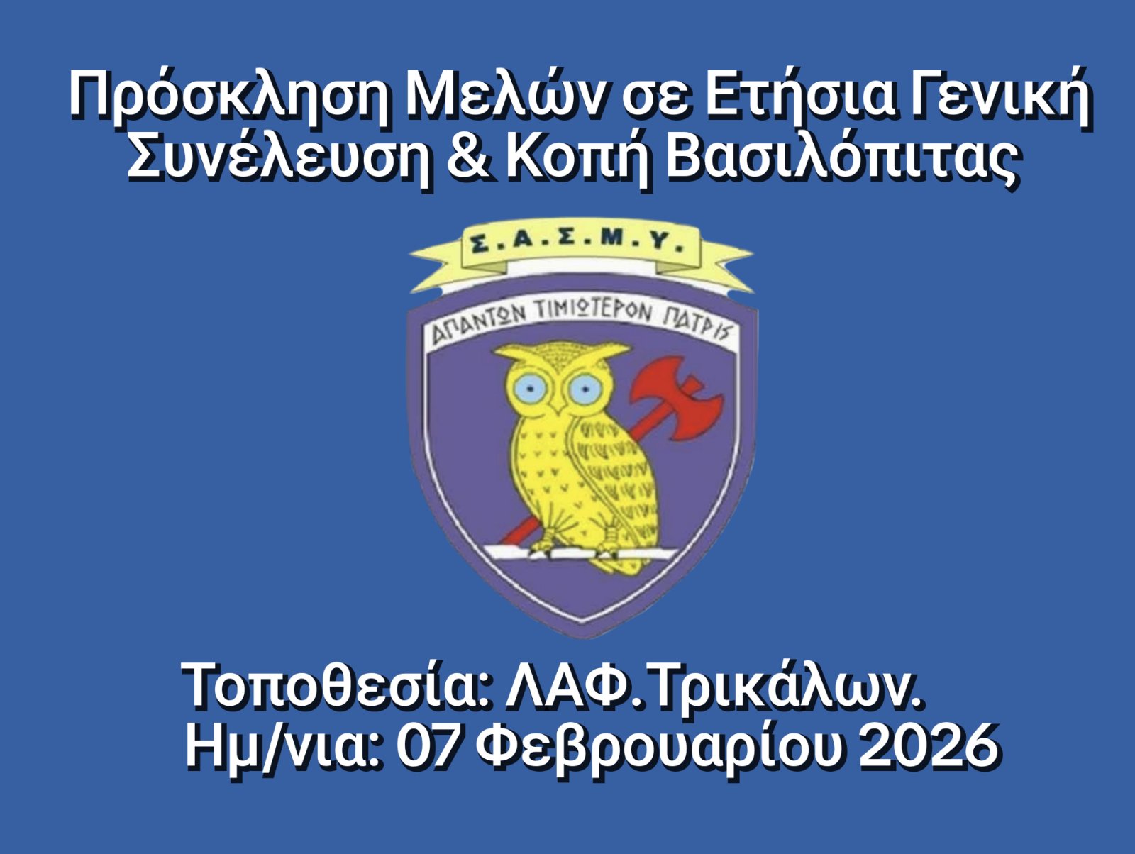 Η συνέλευση θα πραγματοποιηθεί το Σάββατο 7 Φεβρουαρίου 2026, στη Λέσχη Αξιωματικών Φρουράς (ΛΑΦ) Τρικάλων.