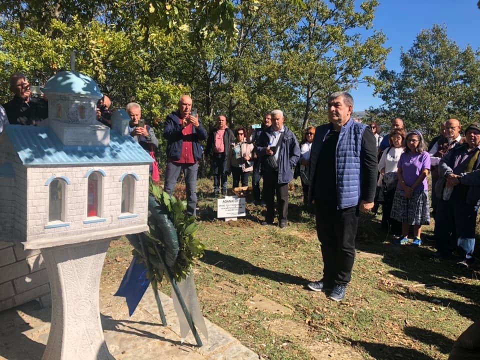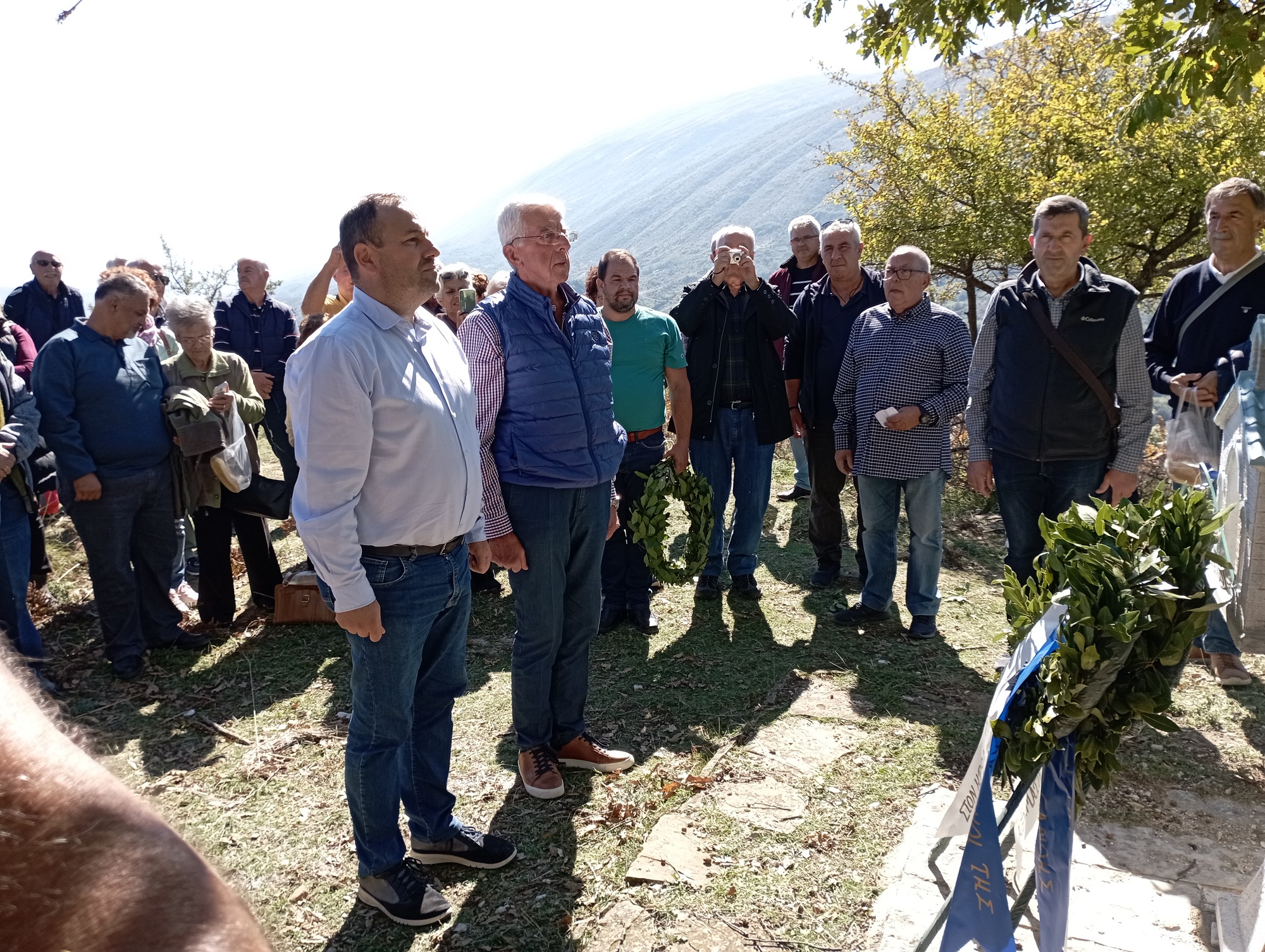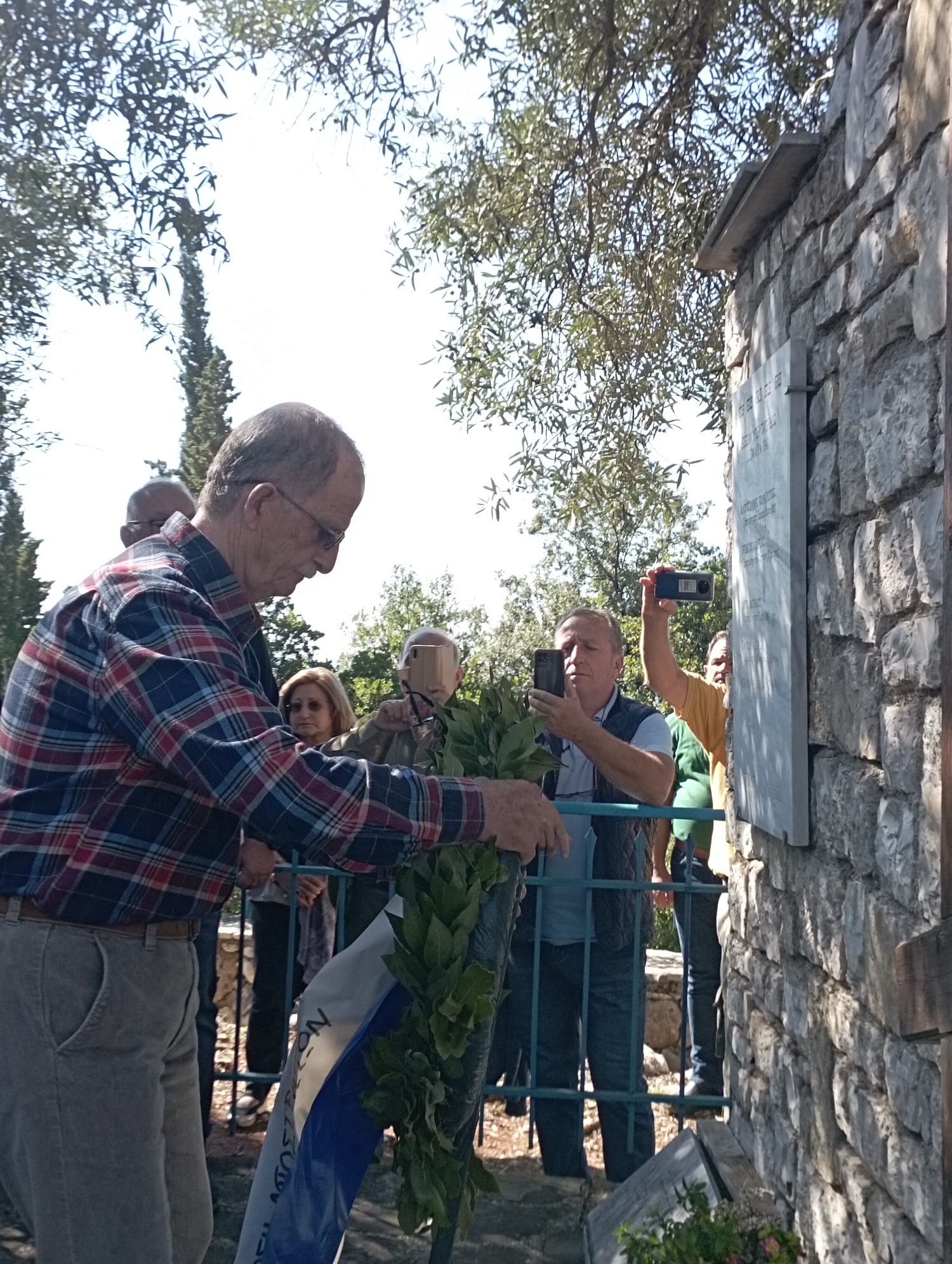 Μας υποδέχθηκε με συγκίνηση στην αυλή της. Τελέσαμε τρισάγιο στο μνημείο των έξι πεσόντων στρατιωτών ενώ το τιμητικό στεφάνι κατατέθηκε από τον Ταξχο ε.α Αγησίλαο Κανελλόπουλο. Η κ. Ερμιόνη Μπρίγκου, στη συνέχεια αφηγήθηκε με τη χαρακτηριστική γλυκιά και σεμνή φωνή της τις αναμνήσεις της από τον πόλεμο και την απόκρυψη των σωρών των νεκρών στρατιωτών.