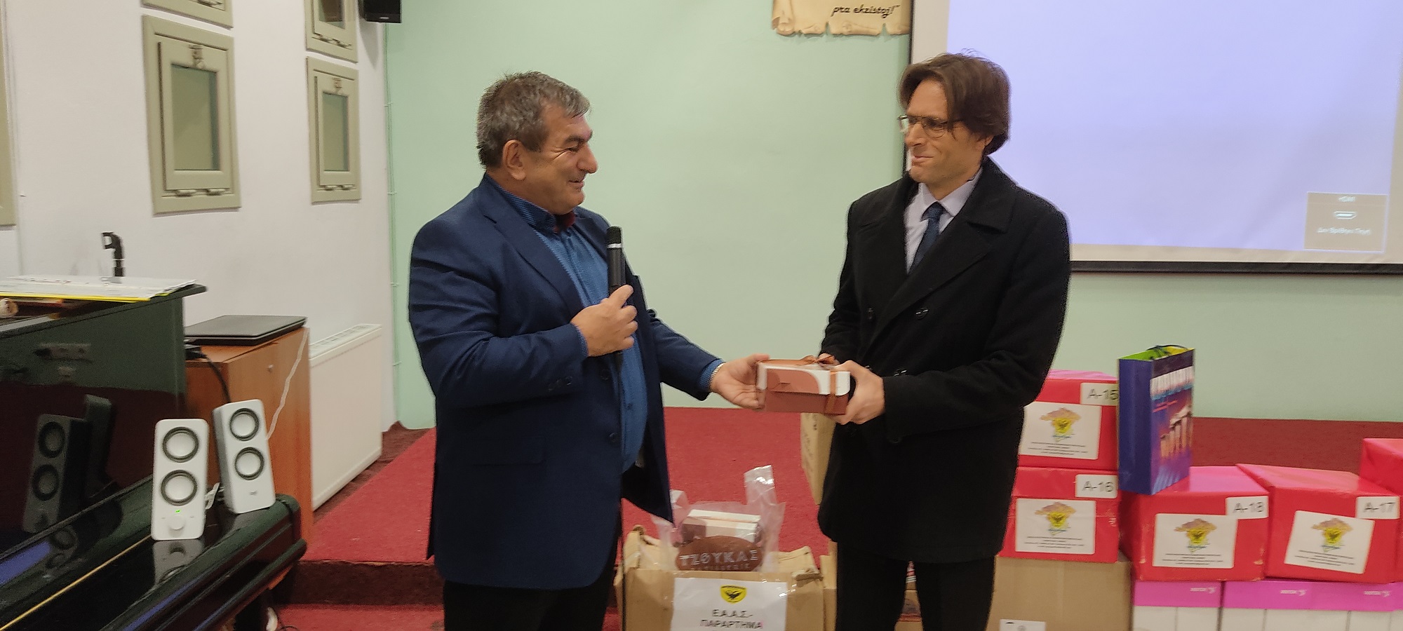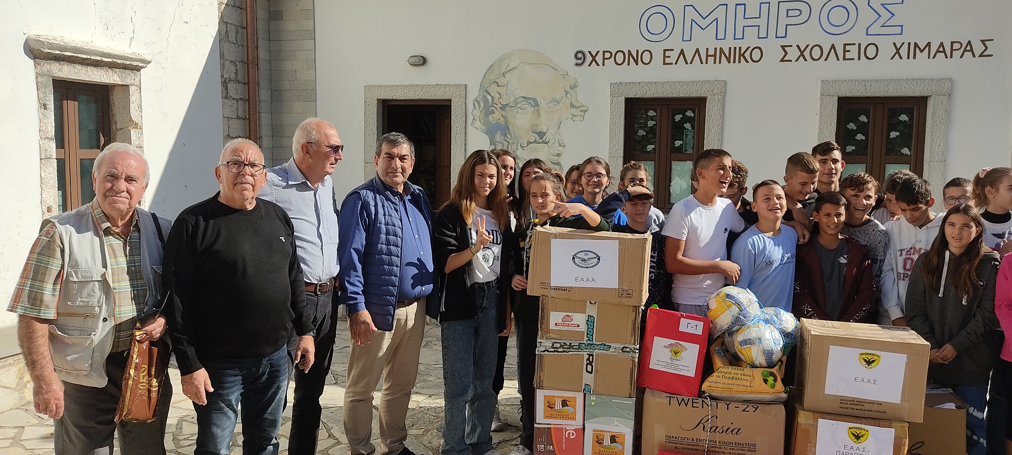 Στο πλαίσιο του ταξιδιού μας συνδυάστηκε επίσκεψη και προσφορά σχολικού εξοπλισμού, γραφικής ύλης και αθλητικών ειδών στα σχολεία της Ομογένειας «ΟΜΗΡΟΣ» στη Χιμάρα , «ΠΝΟΗ ΑΓΑΠΗΣ» στο Αργυρόκαστρο και τον Μεσοπόταμο και στο Γυμνάσιο – Λύκειο «ΠΑΝΤΕΛΗ ΣΩΤΗΡΗ» στο Αργυρόκαστρο όπου το μεγαλύτερο ποσοστό των μαθητών είναι παιδιά της Ελληνικής Εθνικής Μειονότητος.