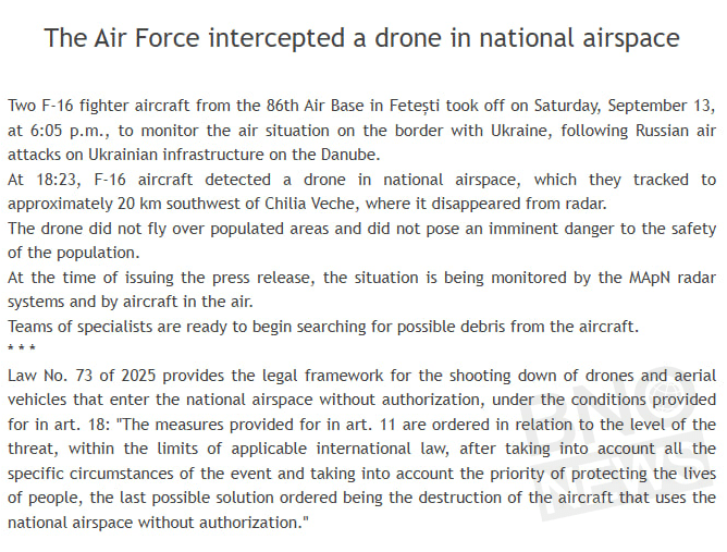 Παράλληλα, οι Ένοπλες Δυνάμεις της Ρουμανίας ανακοίνωσαν ότι παρακολούθησαν ρωσικό drone το οποίο εισήλθε στον εναέριο χώρο της χώρας.