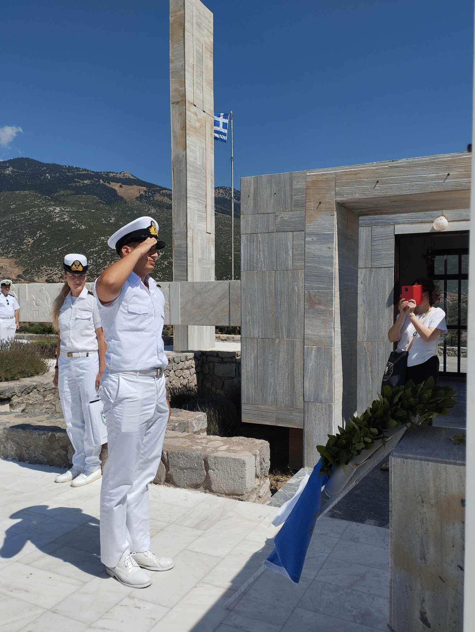 Το κλιμάκιο της Σχολής Ναυτικών Δοκίμων απέδωσε τιμές στα Θύματα – μάλιστα το Στεφάνι κατέθεσε στην <<στήλη>> με τα ονόματα στο Μαυσωλείο ο 4ετης, με το νέο έτος, Δόκιμος Νίκος Ι. Πανουργιάς <<γέννημα- θρέμμα>> του Διστόμου.