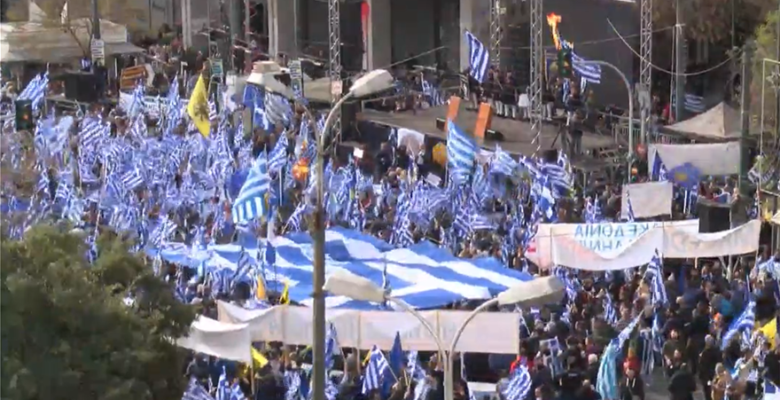 Η τεράστια σημαία, για την οποία ο ομογενής Κωνσταντίνο Κατσίφα, που στις 28/10/2018 δολοφονήθηκε από τους επίλεκτους της αλβανικής αστυνομίας στους Βουλιαράτες της Βορείου Ηπείρου, πέρυσι είχε διαθέσει ένα μηνιάτικο μισθό του, προκειμένου να την ράψει, έφτασε στο Συλλαλητήριο και τοποθετήθηκε από τους συντρόφους του στην εξέδρα.