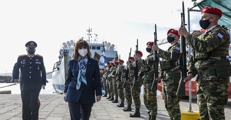 «Την ΠτΔ υποδέχτηκαν με στρατιωτική τελετή στο λιμάνι της νήσου Γαύδου, ενώ η ίδια χαιρέτισε την ελληνική σημαία που έφεραν Έλληνες στρατιώτες στο νησί.