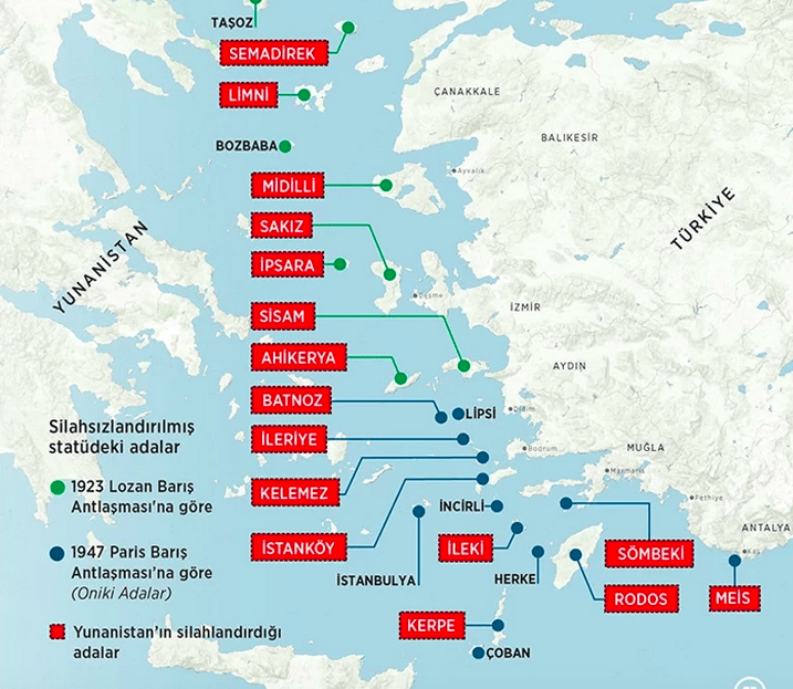 Το δημοσίευμα πλαισιώνεται και από χάρτη με τα 23 νησιά, που πρέπει να έχουν αποστρατικοποιημένο καθεστώς, κι επίσης από ένα χάρτη του λεγόμενου τουρκο-λιβυκού μνημονίου.