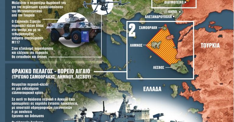 Όμως η θαλάσσια περιοχή από το Θρακικό νοτιοανατολικά της Σαμοθράκης έως τη Λέσβο θεωρείται «κλειδί» στο ενδεχόμενο ελληνοτουρκικής κρίσης.