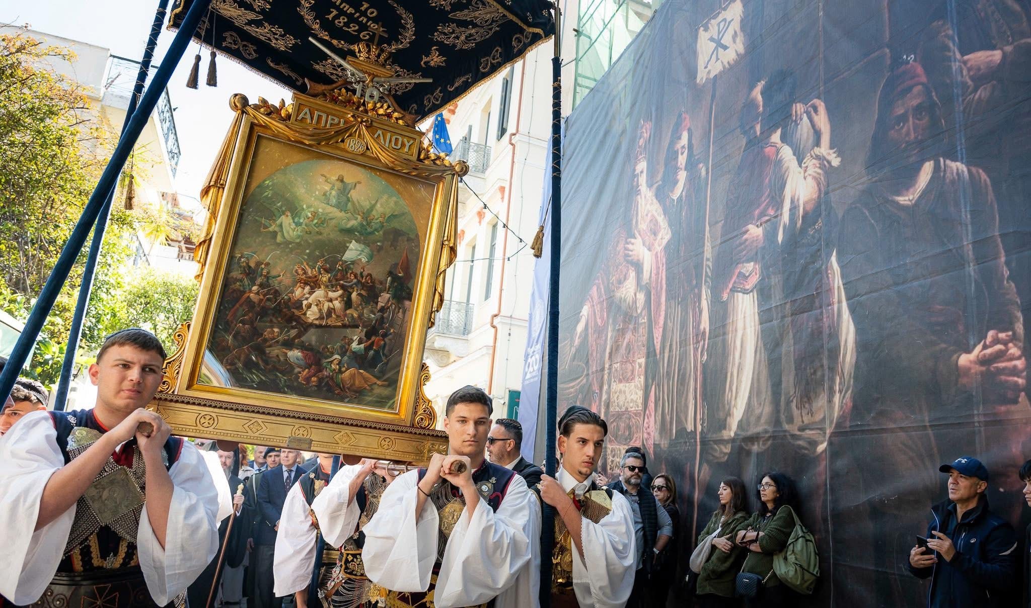 Στη συνέχεια μετέβη στο Μουσείο Ιστορίας και Τέχνης – Πινακοθήκη, από όπου πραγματοποιήθηκε η μεταφορά της Εικόνας της Εξόδου, του Ιερού Λάβαρου, του Τιμίου Σταυρού του Επισκόπου Ρωγών και Κοζύλης Ιωσήφ, καθώς και του καριοφιλιού του στρατηγού Δημητρίου Μακρή, προς τον Ιερό Μητροπολιτικό Ναό του Αγίου Σπυρίδωνος. Πρόκειται για κειμήλια με ιδιαίτερη ιστορική και εθνική αξία, που κρατούν ζωντανή τη μνήμη του αγώνα και της αυτοθυσίας των πολιορκημένων του Μεσολογγίου.