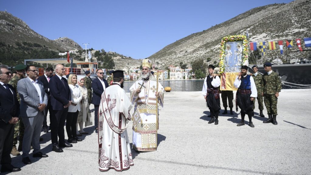 Επίσης ο υπουργός έδωσε το παρών στο Καστελλόριζο στην πανηγυρική Θεία Λειτουργία, ανήμερα της εορτής των πολιούχων Αγίων Κωνσταντίνου και Ελένης, όπως και στη λιτάνευση της ιερής εικόνας τους.